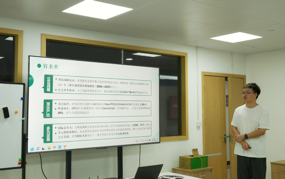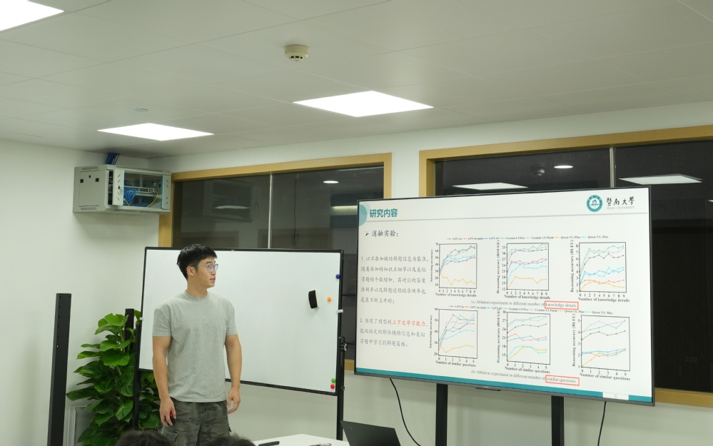 接着,由博士研究生代表白友恒和硕士研究生代表尹智剑同学分别对同学们做了分享。白友恒分享了自己在智慧教育、知识追踪领域的研究成果,强调了研究院在硬件、学术、经费等方面的资源优势,团队温暖互助的氛围,以及面向未来的发展前景,并分享了具体研究框架与创新方法。尹智剑分享了其在多模态大语言模型教育应用方面的研究。他针对现有解题评估局限性,构建了EduQS数据集以更专业评估模型推理能力,并计划进一步研究模型从“解题”到“出题”的潜力,为智慧教育提供新思路。