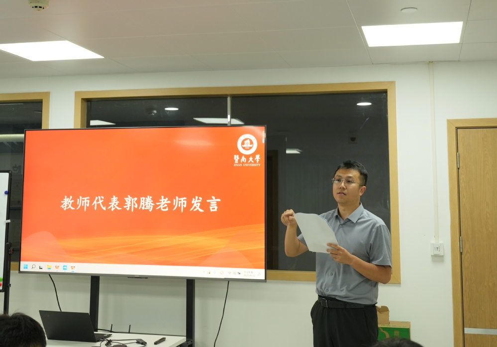 接着,研究院教师代表郭腾老师对新生寄语,他向新同学提出三点核心建议:一是做好注意力管理,专注当下,培养抵御干扰的定力;二是提升科研能力,通过阅读顶级论文提升学术品味,强化代码实现能力;三是端正做事态度,鼓励从全力以赴后的错误中成长。他勉励同学们成为有内在定力的研究者,在科研道路上踏实前行。