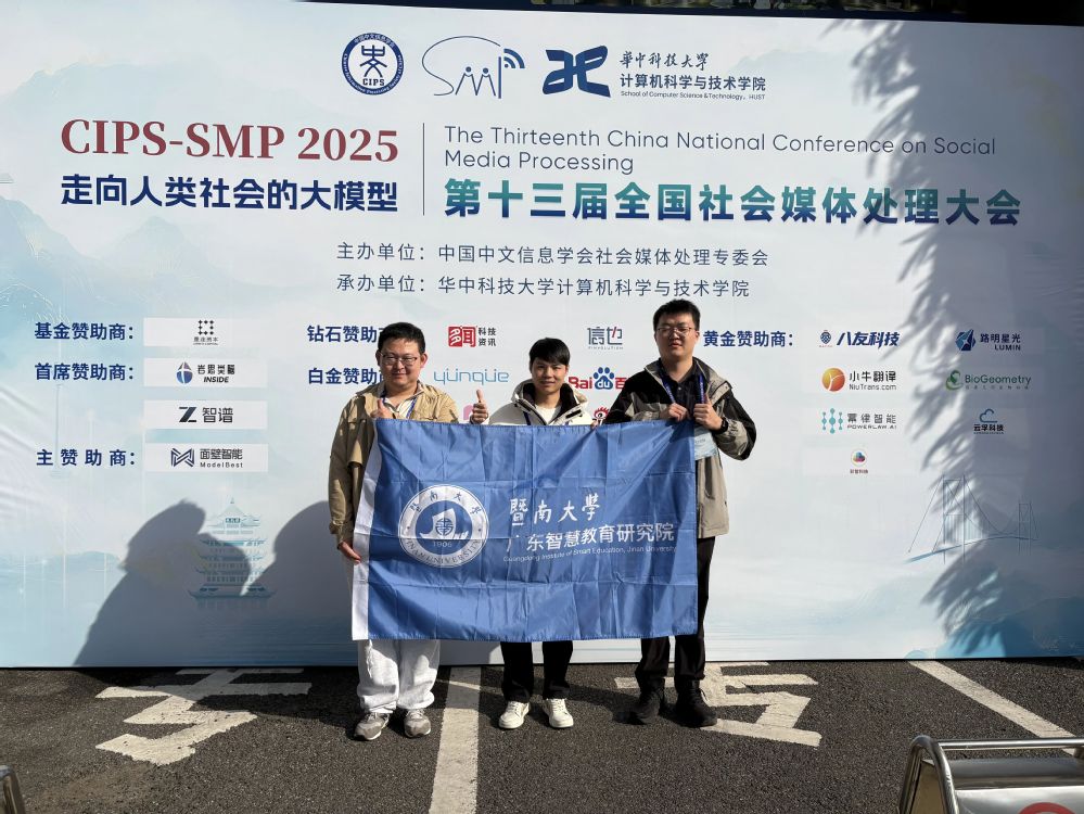 近日,暨南大学广东智慧教育研究院博士研究生白友恒、李薛毅、程腾腾,于2025年11月20日至23日受邀前往湖北武汉,参加第十三届全国社会媒体处理大会(CIPS-SMP 2025),并在会议海报展示环节展示学术成果。本次大会由中国中文信息学会社会媒体处理专委会主办,华中科技大学计算机科学与技术学院承办,以“走向人类社会的大模型”为主题,汇聚全国各地1100余位专家、学者,吸引190多家单位参与。大会聚焦大模型与人类发展的深度融合,设置包括主旨报告、讲习班、分论坛、海报展示等多种形式,深入探讨大模型赋能人类社会可持续发展的路径。